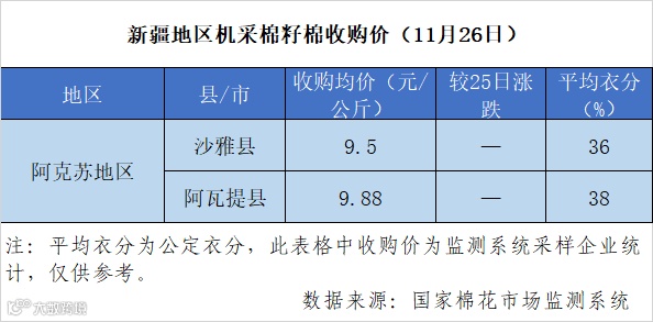 储备棉成交延续活跃态势,新疆棉和进口棉全部成交。11月22日-26日,中国储备棉管理有限公司累计挂牌储备棉8.51万吨,累计成交量5.83万吨,成交率69%。其中新疆棉累计挂牌1.00万吨,成交率100%;地产棉累计挂牌6.01万吨,累计成交3.33万吨,成交率55%;进口棉累计挂牌1.50万吨,成交率100%。