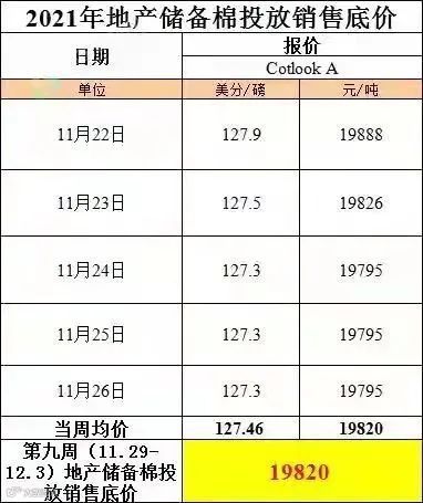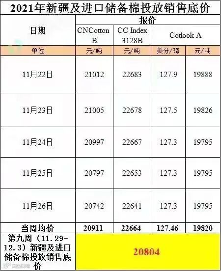 根据国家有关部门要求和2021年第二批中央储备棉投放公告,第九周地产棉投放销售底价19820元/吨(折标准级3128B),较前一周上涨61元/吨;新疆及进口储备棉投放销售底价20804元/吨(折标准级3128B),较前一周下跌12元/吨。