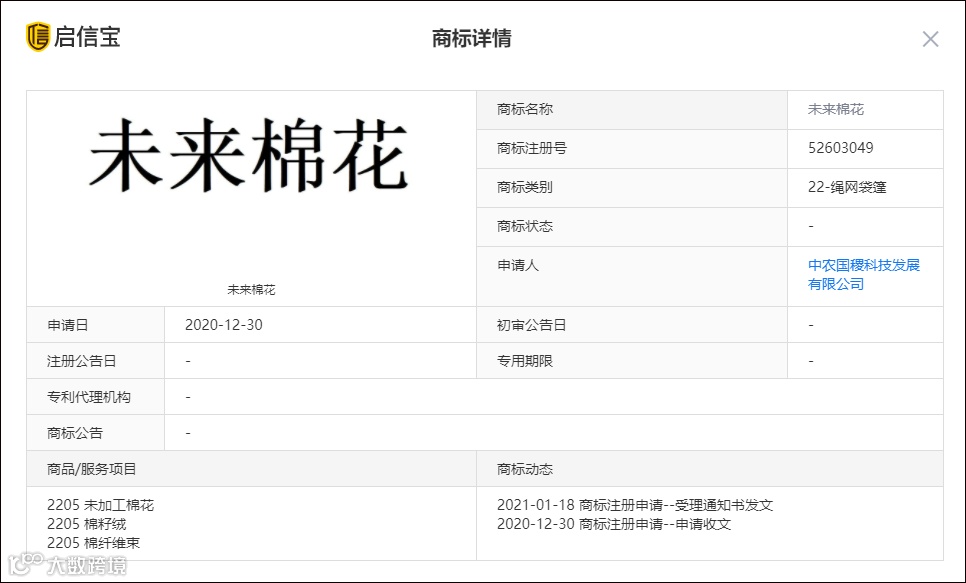 此外,从启信宝获悉,中农国稷于2020年12月30日申请注册“未来棉花”商标,目前尚处于“等待实质审查”阶段。