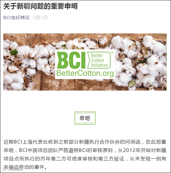 此外,BCI上海代表处曾于3月1日在微信公众号郑重申明,BCI中国项目团队从2012年开始对新疆项目点所执行的历年第二方可信度审核和第三方验证,从未发现一例有关强迫劳动的事件。