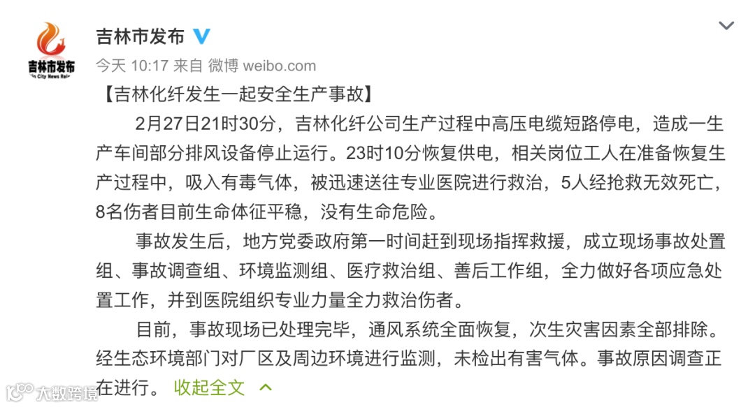 吉林化纤公司发生安全生产事故:工人吸入有毒气体致5死8伤!