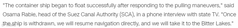苏伊士运河管理局表示,Ever Given已成功浮起,如果潮水上涨,还将进一步尝试移动船只。一旦该船被移至较宽地段的等候区域,运河就能恢复通航。
