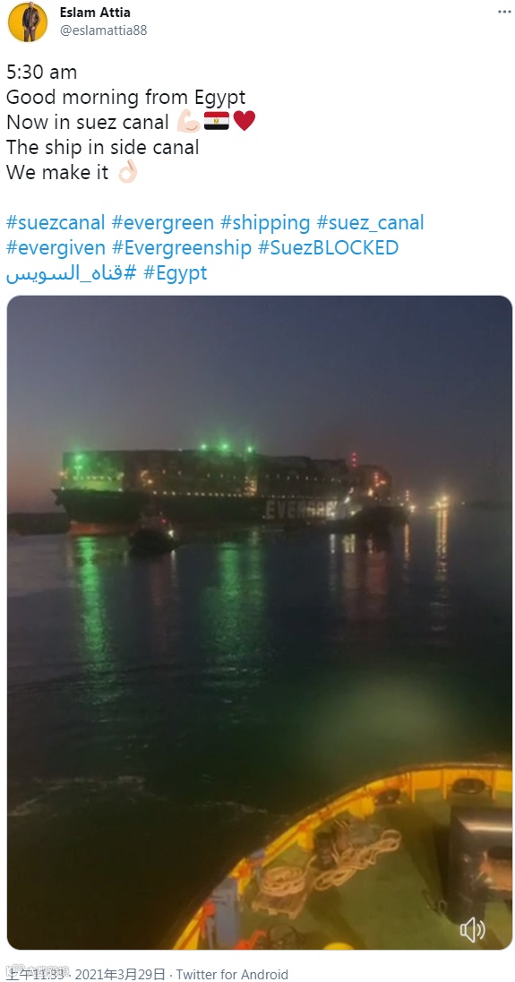 参与救援的工作人员发推庆祝Ever Given重回河道,据说现场一片鸣笛和欢呼。