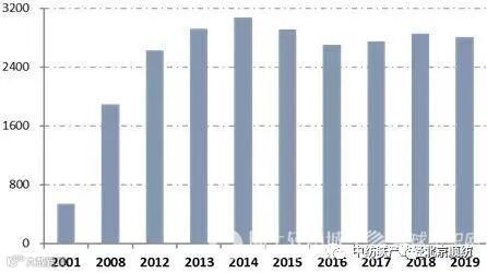 图4:2001~2019年纺织品服装出口总额