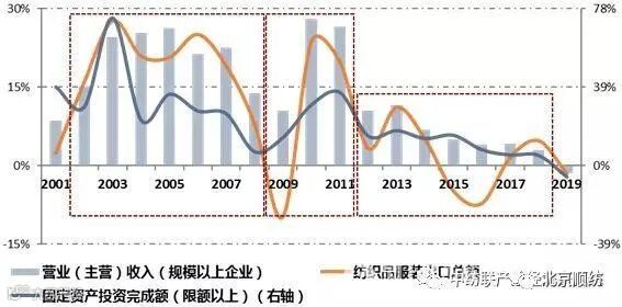 图2:2001~2019年纺织服装产品出口及内销指标同比增长情况