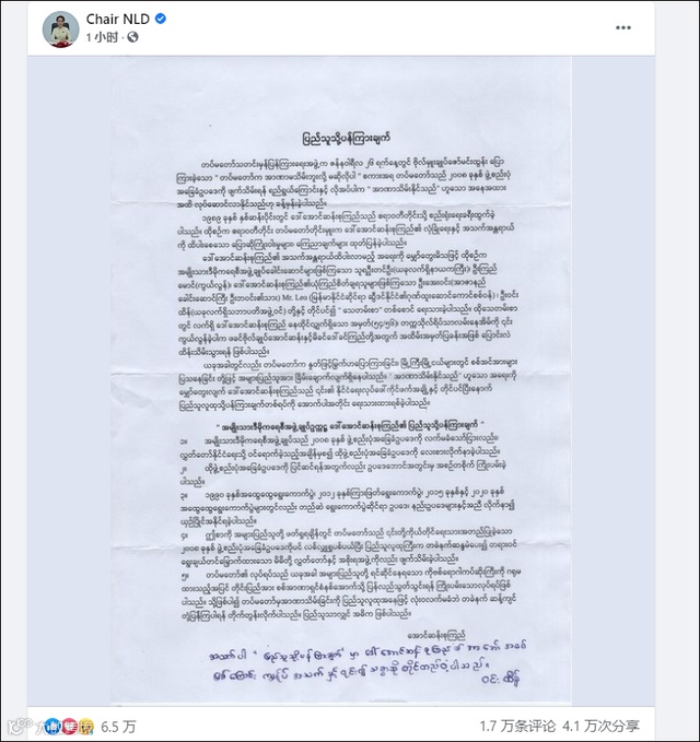 当天中午,昂山素季的脸书账号发表了一份声明,敦促缅甸民众反对当天上午发生的“政变”和任何回归“军事独裁”的做法。
