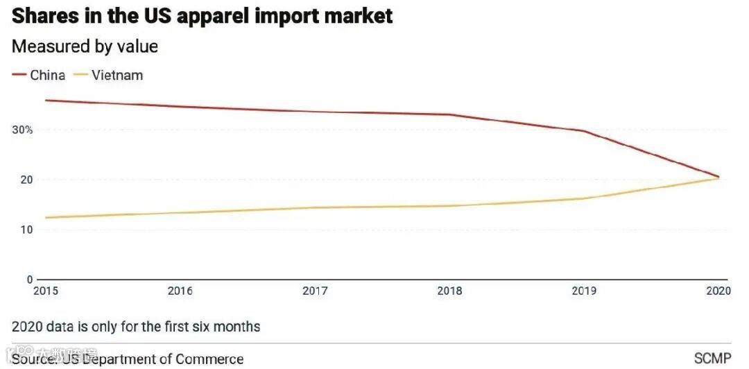 七个月前,中国仍是美国时装公司最大的产品供应国,但由于冠状病毒和世界两大经济体之间的脱钩关系,中国相对越南的显著优势已经消失。