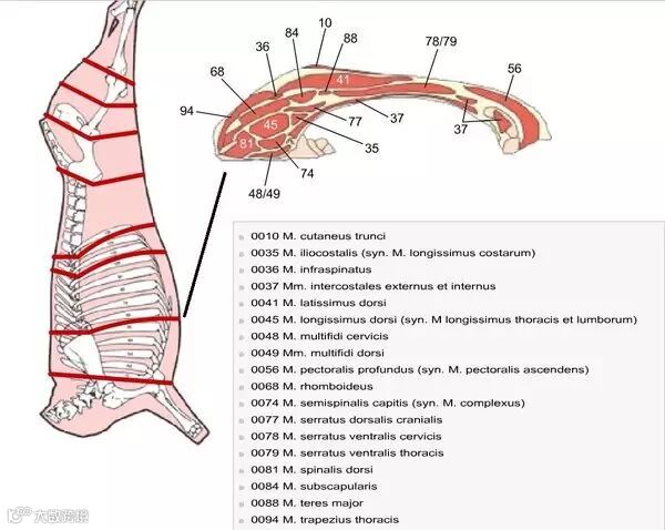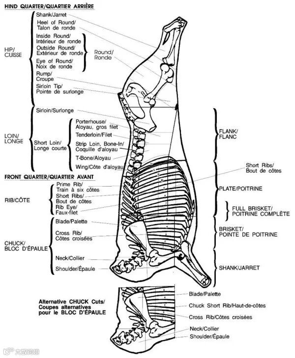 下面这张图是整头牛,按欧洲或美洲的分割法分出来的肉名,不用仔细去看。因为很多情况下,说胸啊、腹啊,哪怕是英文名,不同国家的分割法都不一样,最方便就是拿骨骼横剖面来说明。