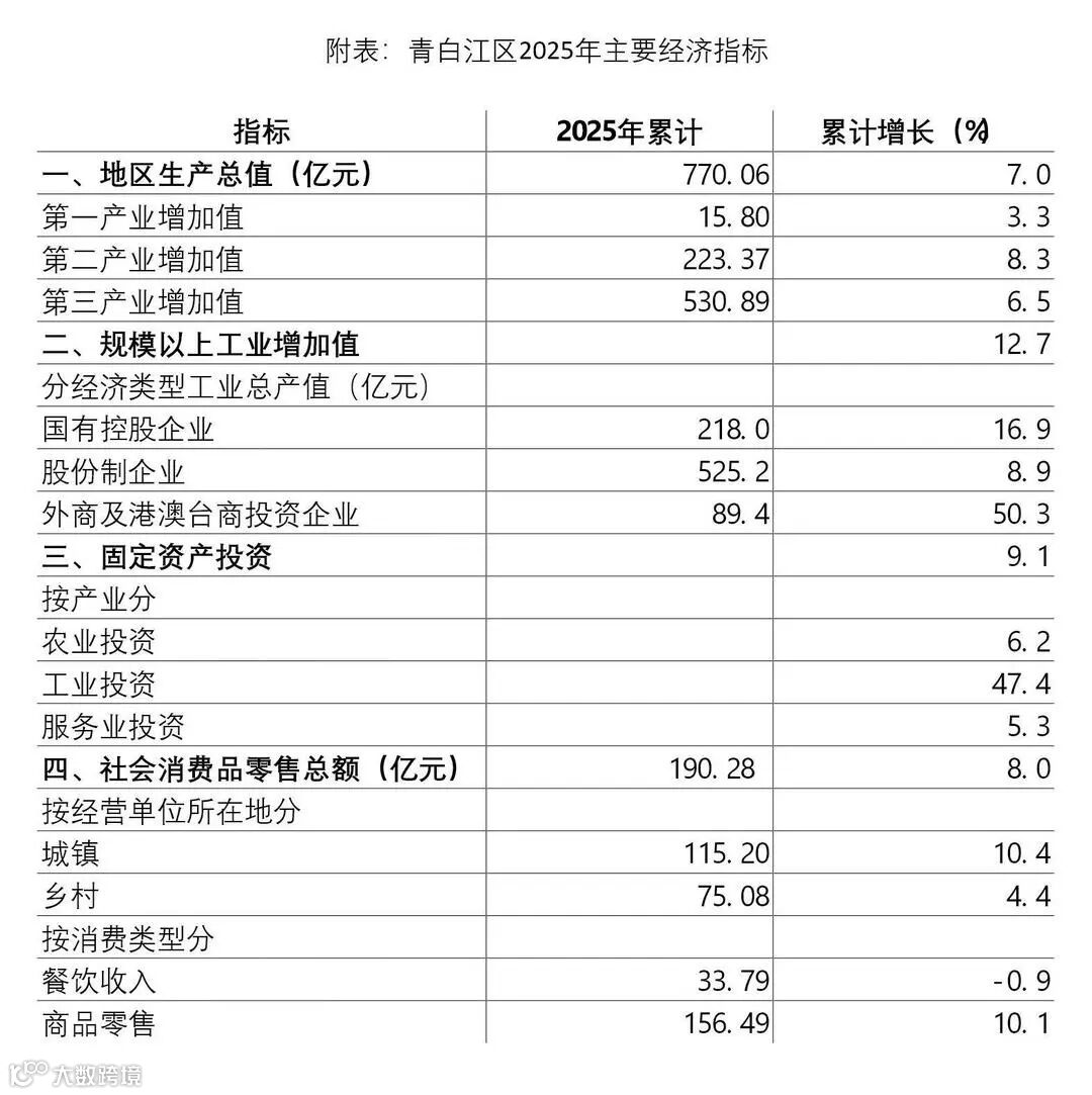 根据地区生产总值统一核算结果,2025年,全区地区生产总值770.06亿元,按不变价格计算,比上年增长7.0%。分产业看,第一产业增加值15.80亿元,增长3.3%;第二产业增加值223.37亿元,增长8.3%;第三产业增加值530.89亿元,增长6.5%。