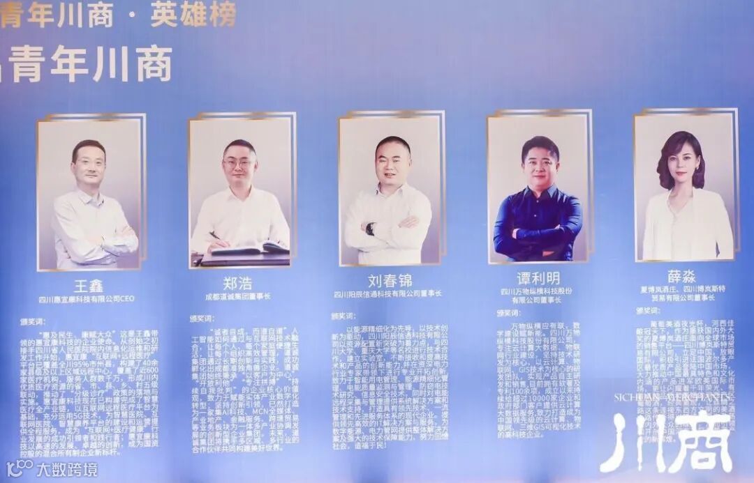 峰会现场还表彰了一批杰出青年川商。17名青年企业家分获“2020杰出青年川商年度人物”“2020杰出青年川商”“2020杰出青年川商创新奖”三大奖项,获奖者所在行业覆盖了智媒、房地产、教育、投资、科技、新能源、新材料、餐饮酒类等,充分体现川商企业蓬勃生长、涉及领域广泛、产业业态丰富的特性,为更好的塑造一批“有信念、有梦想、有本领、有贡献的年轻一代民营企业家队伍”,为实现“两个一百年”奋斗目标和推动治蜀兴川再上新台阶贡献了青年川商的奋进力量。