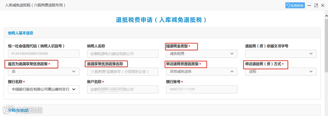 系统自动带出“提退税金类型”为“减免税费”,“是否为追溯享受优惠政策”为“是”,“追溯享受优惠政策名称”为“‘六税两费’追溯享受(小型微利企业)”,“申请退税费原因类型”为“其他减免退库”,“申请退抵税(费)方式”为“退税”且不可修改。