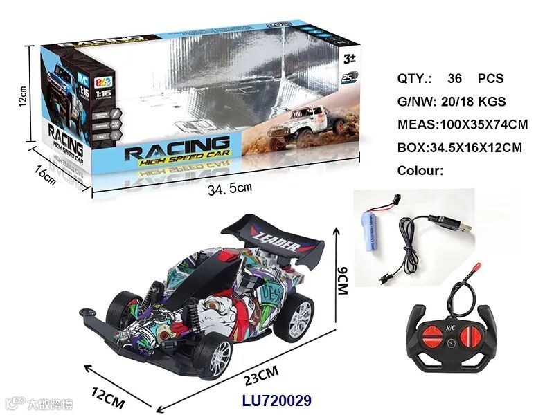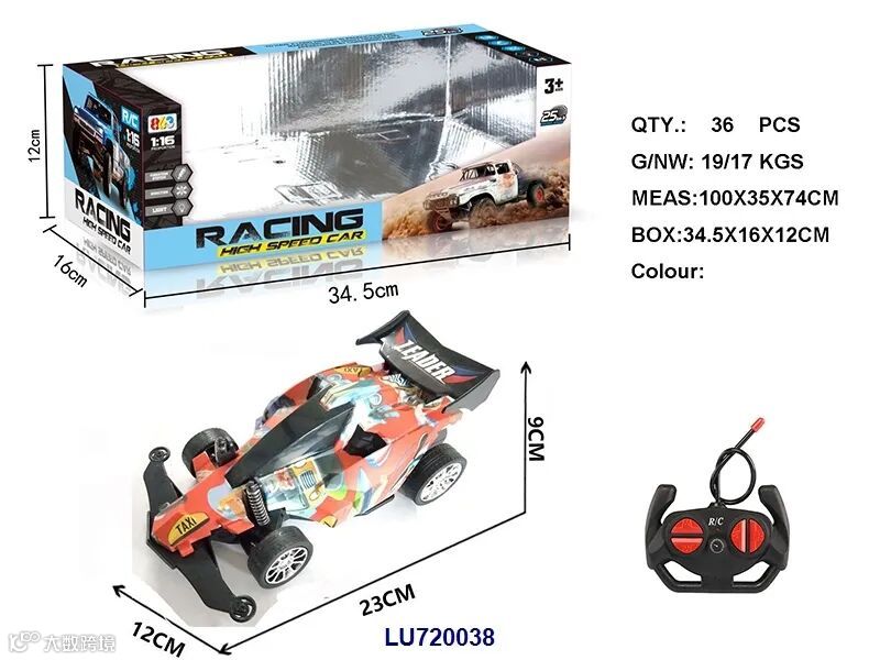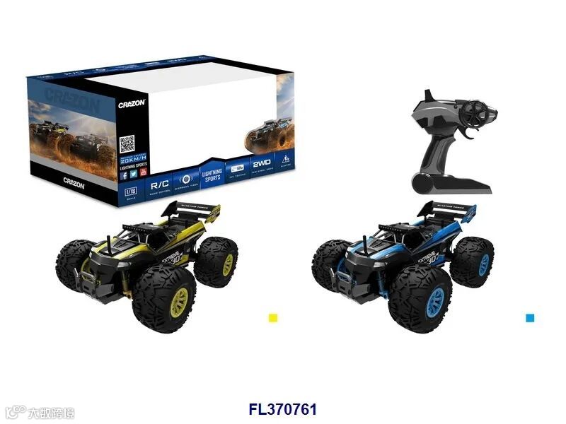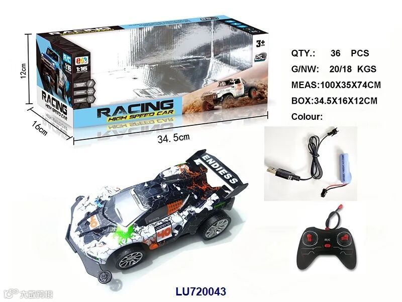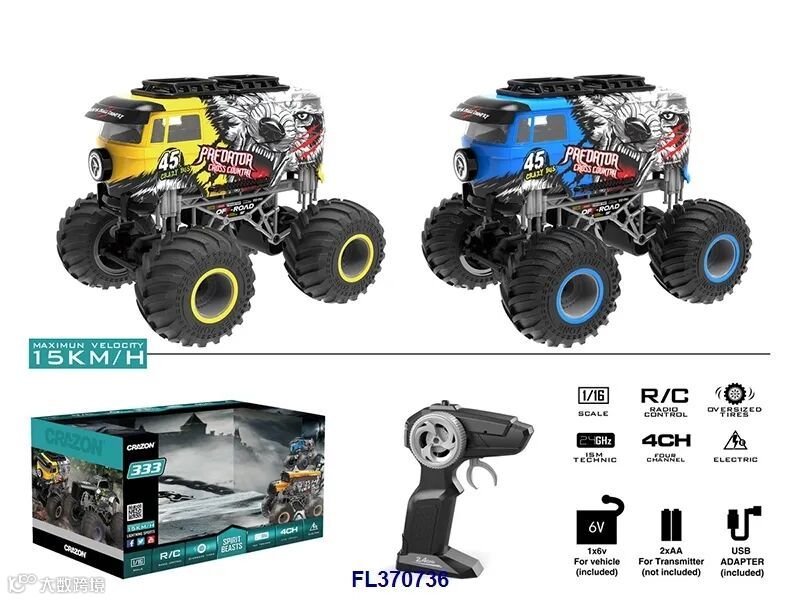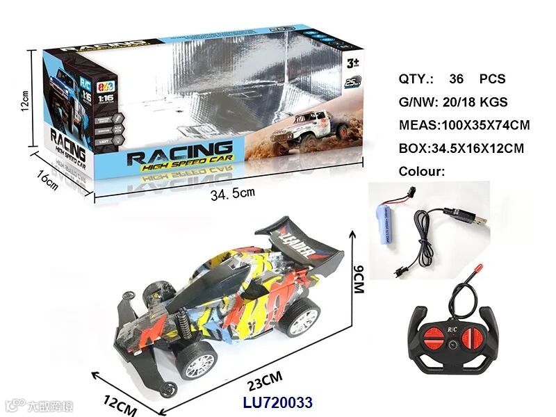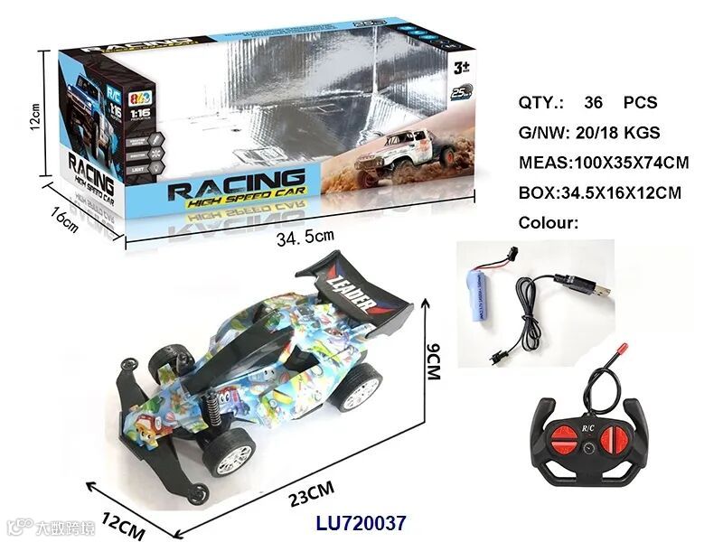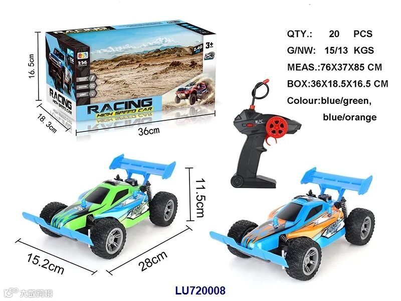 USB充电线+车身7.4V 1200毫安锂电,遥控器用2x1.5VAA,电池无包,蓝/黄2色,时速20KM/H)