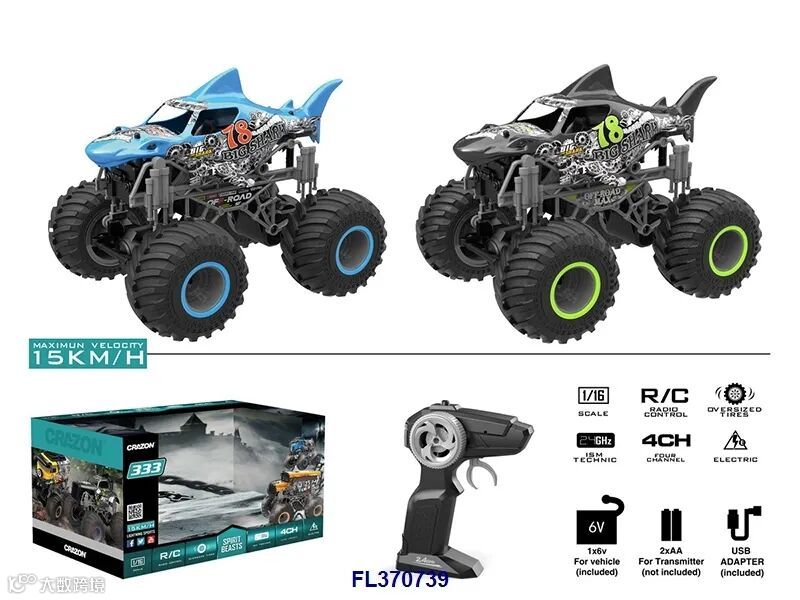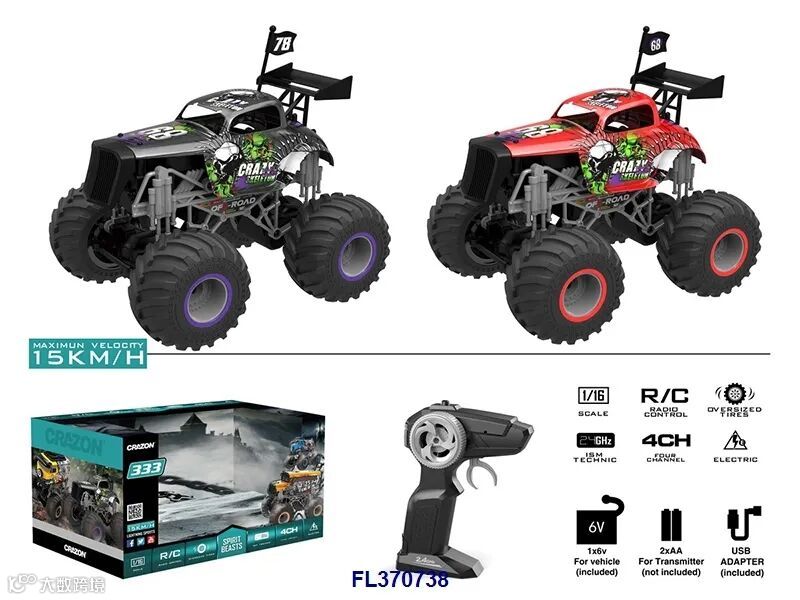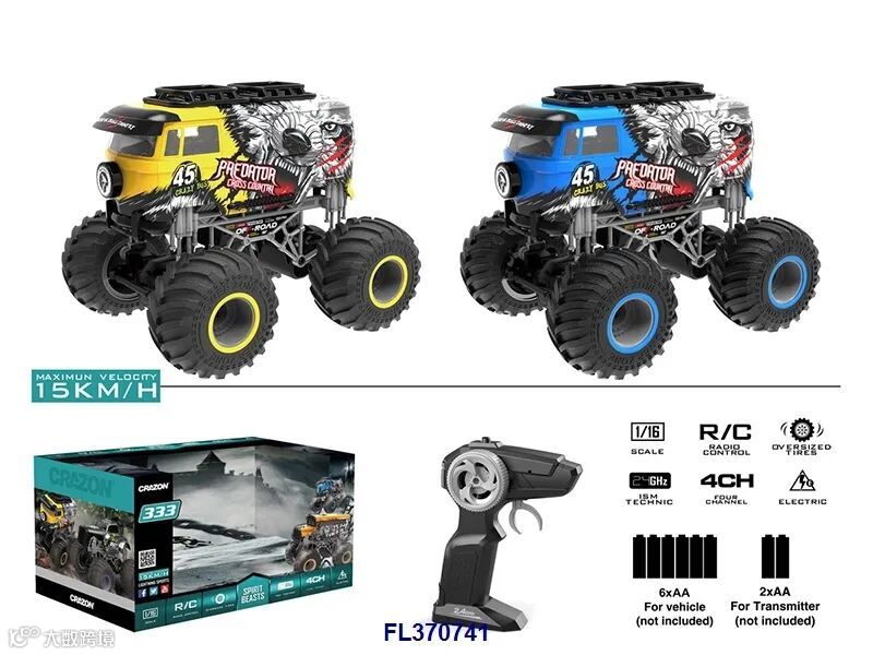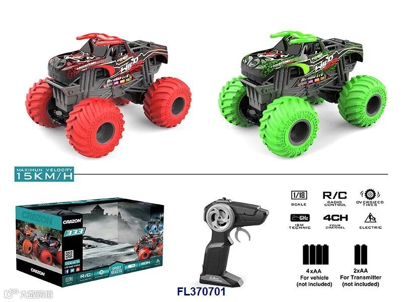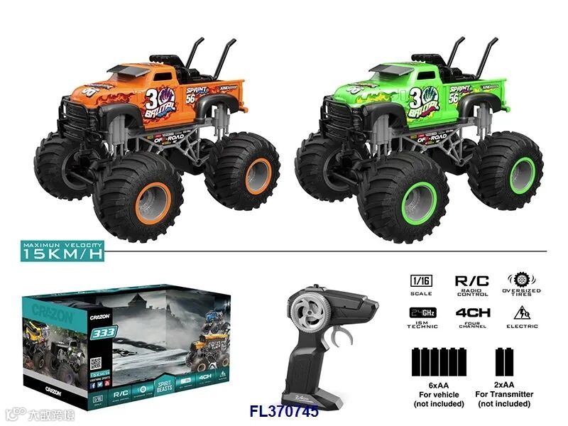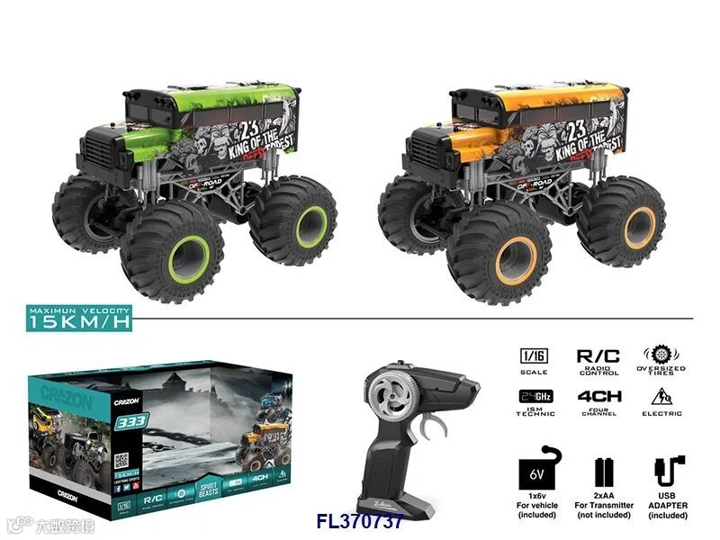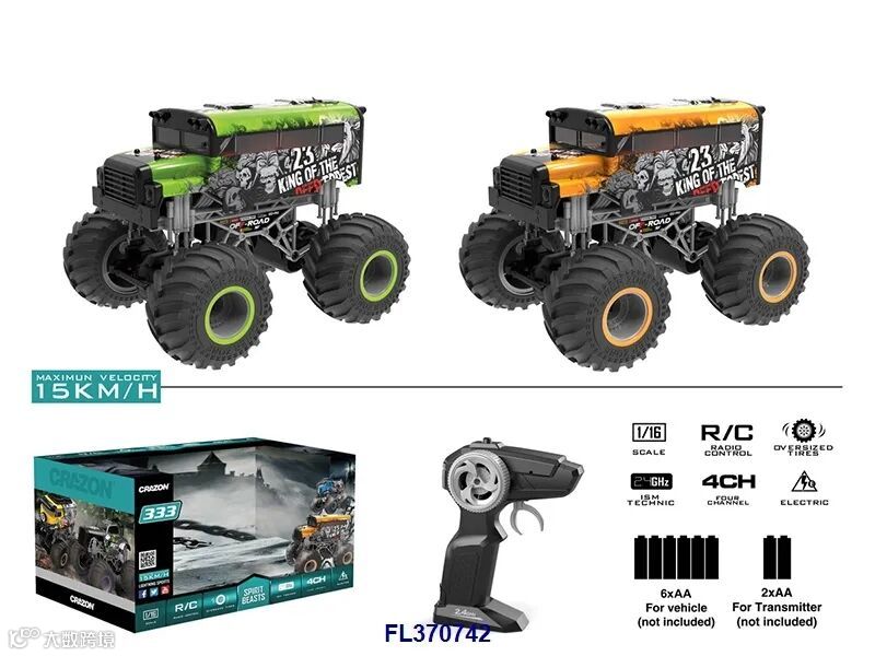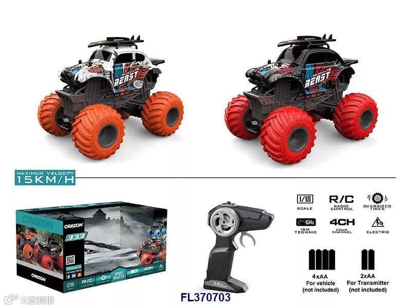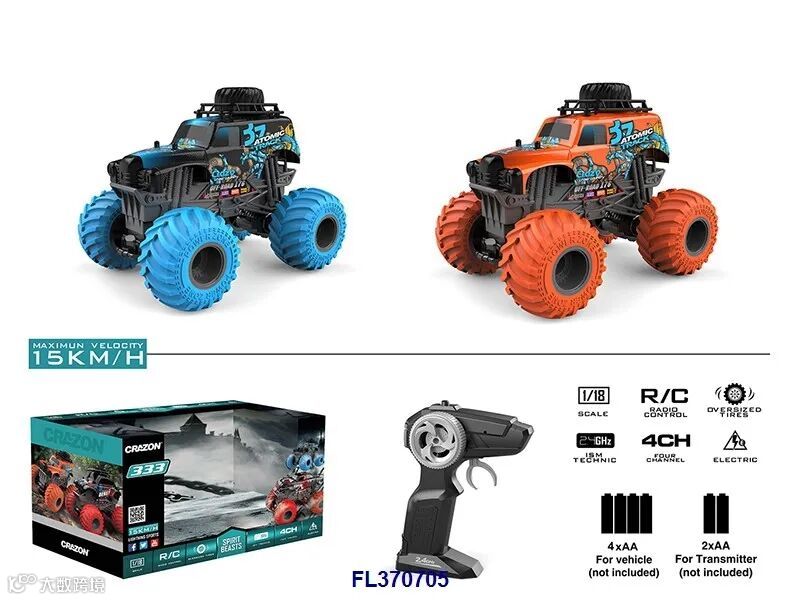 1:18四通2.4G双驱大轮遥控越野车(不包电,车身用4xAA遥控器用2xAA,黑/橙2色)