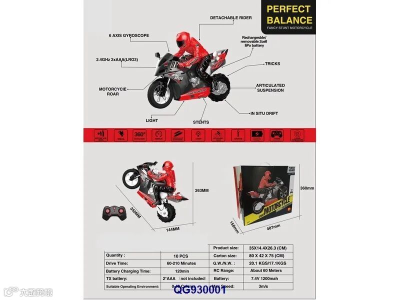 产品功能;向前 ,向后,左转,右转,室内模式,室外模式,地形切换,原地掉头,自稳平衡,360度漂移,特技单轮站立等功能.产品通过后轮橡胶平衡轮牵引控制可自稳平衡,颠覆传统遥控摩托车玩具.