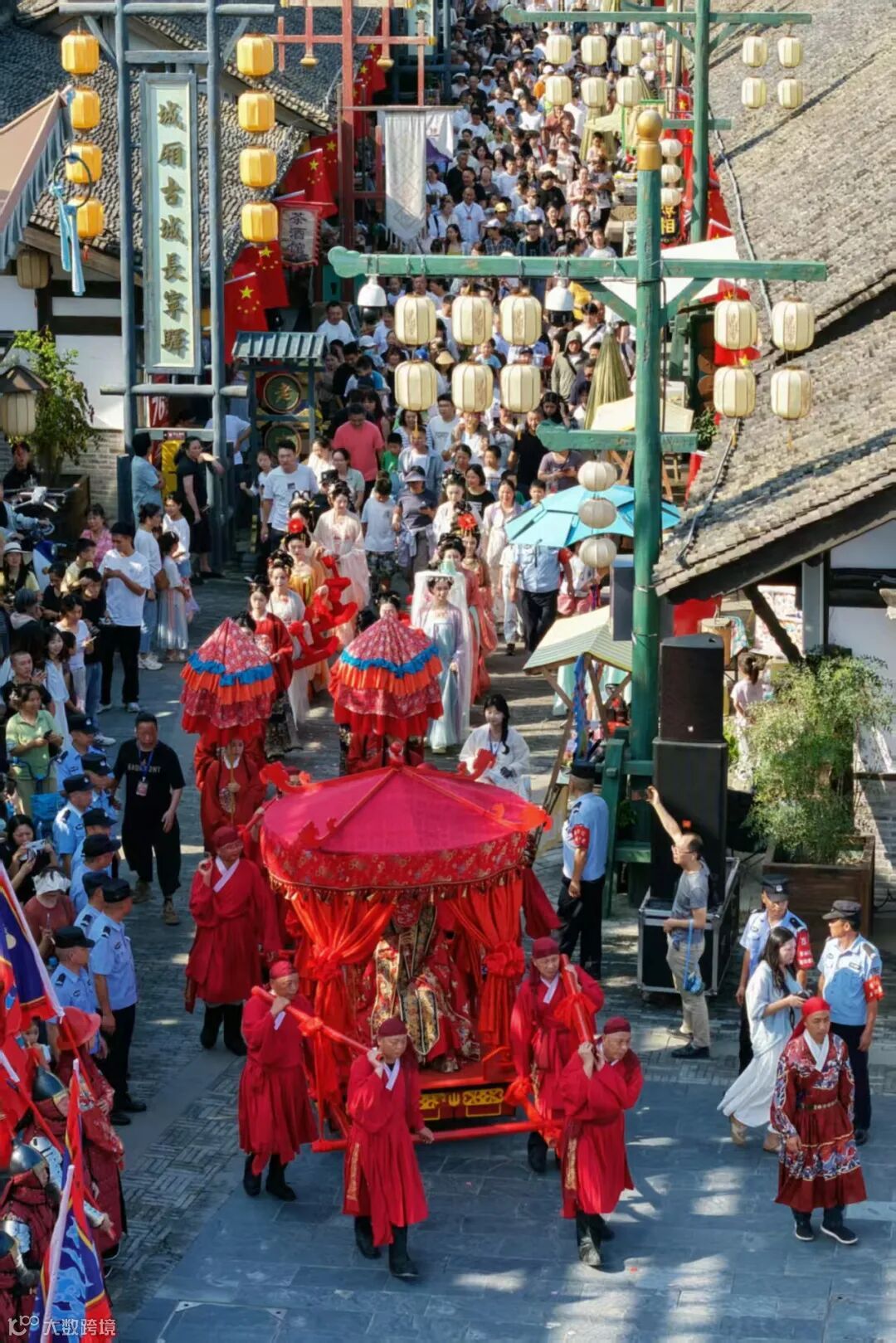 身着婚服的队伍穿行古街