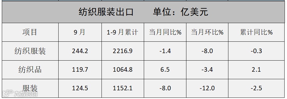 据海关总署数据,9月我国纺织服装出口额244.2亿美元,同比下降1.4%,环比下降8%。其中纺织品出口额119.7亿美元,同比增长6.5%,环比下降3.4%;服装出口额124.5亿美元,同比下降8%,环比下降12%。
