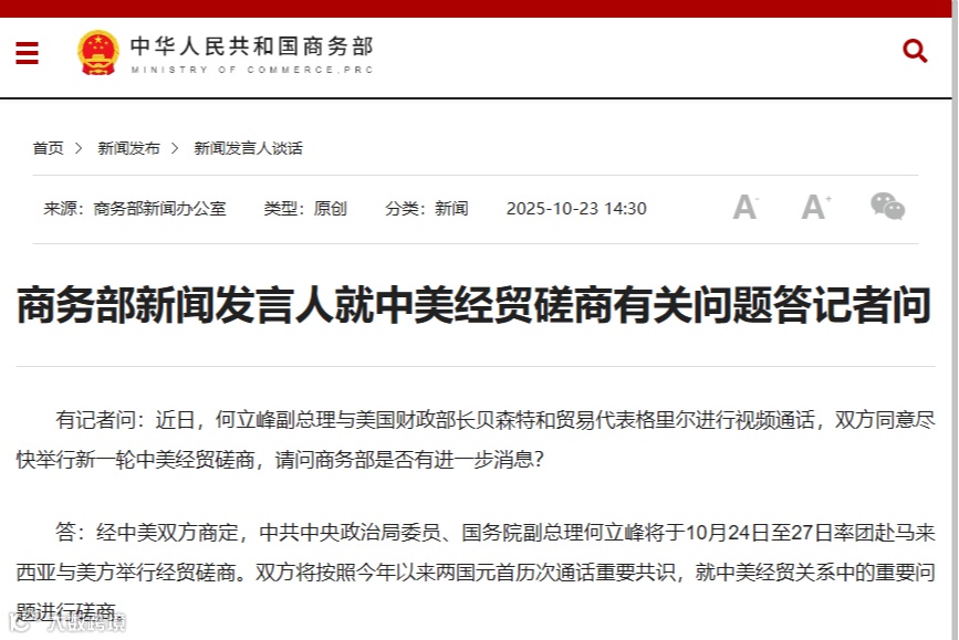 有记者问:近日,何立峰副总理与美国财政部长贝森特和贸易代表格里尔进行视频通话,双方同意尽快举行新一轮中美经贸磋商,请问商务部是否有进一步消息?