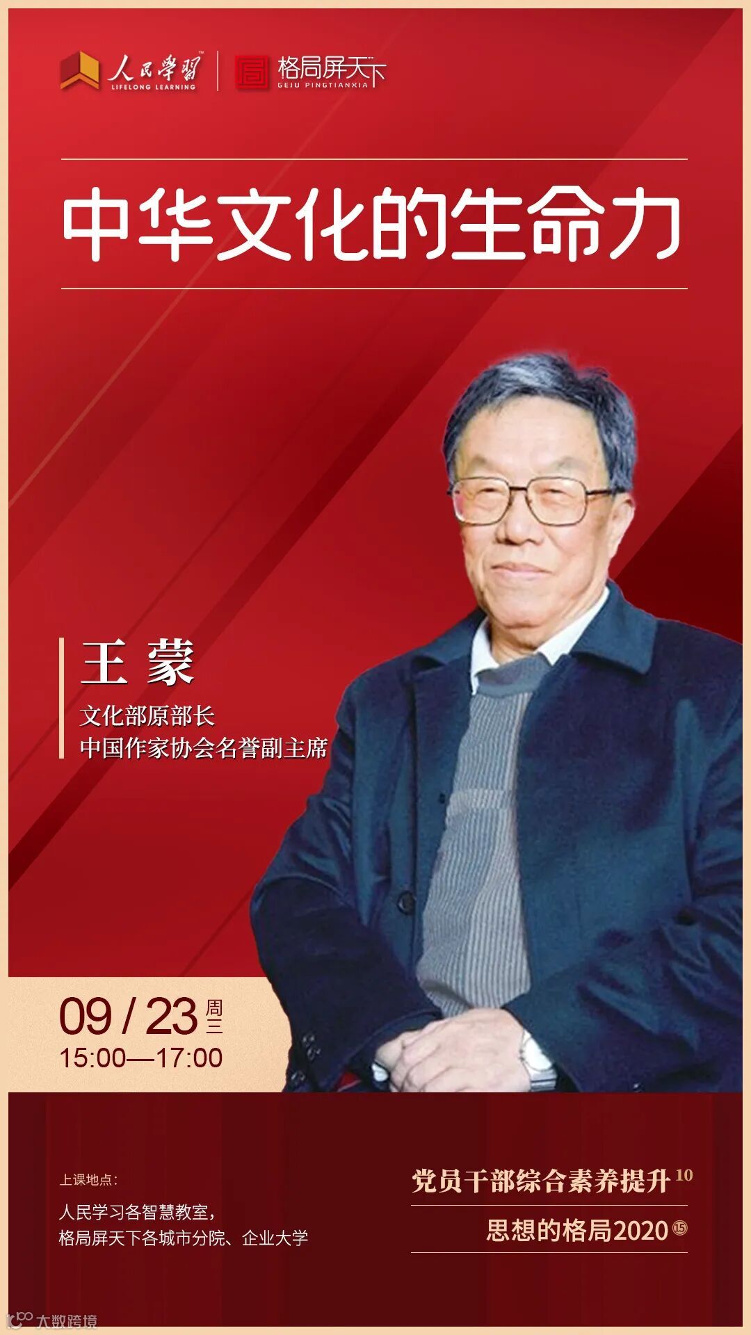 2020年9月23日,文化部原部长、中国作家协会名誉副主席王蒙将莅临“人民学习·格局屏天下”演播室,为各地党员干部和企业家主讲《中华文化的生命力》。