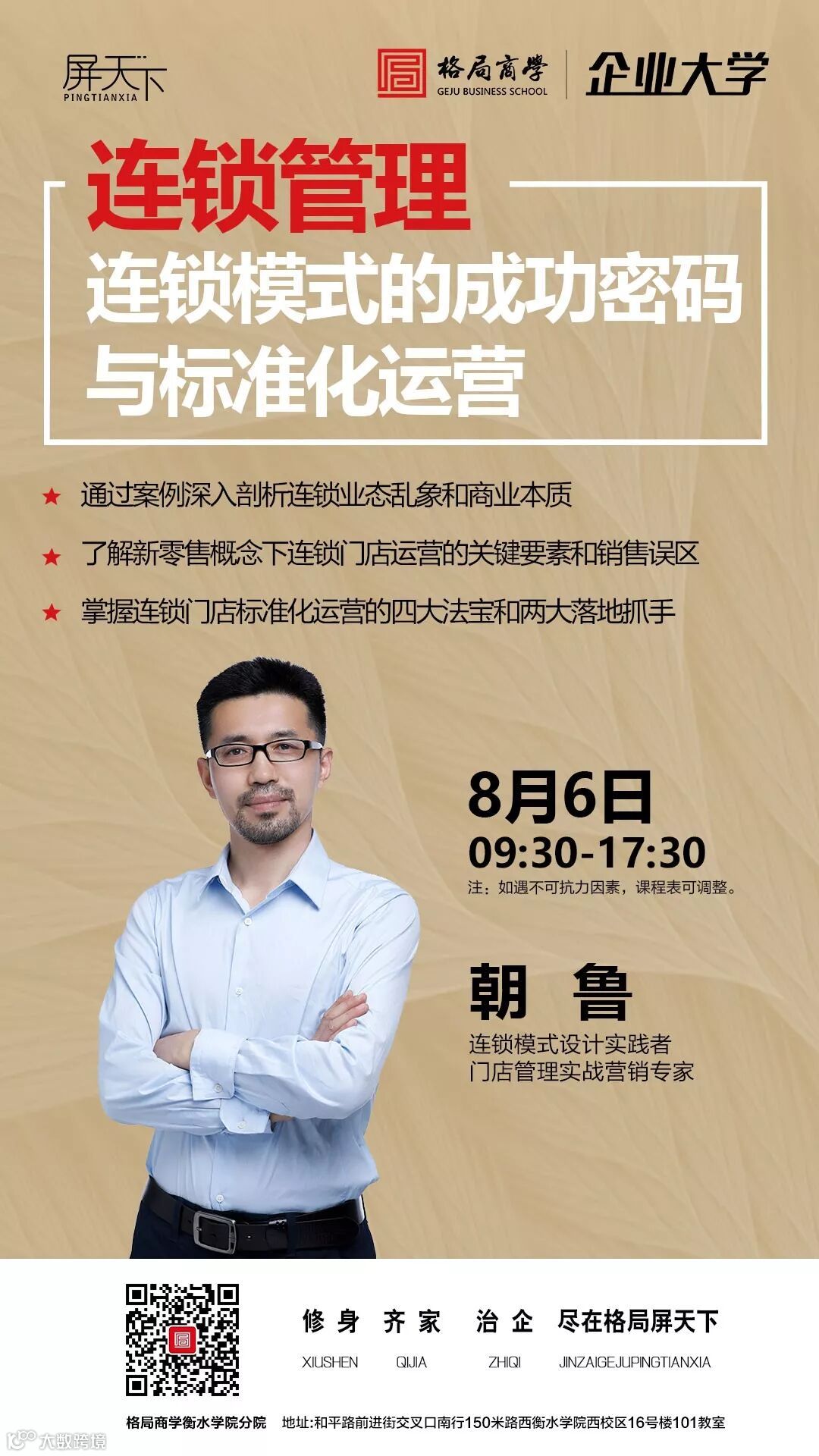 8月6日,格局商学衡水学院分院特邀连锁模式设计实践者、门店管理实战营销专家朝鲁老师为大家带来《连锁管理——连锁模式的成功密码与标准化运营》,深度分享中国连锁业态的乱象和商业本质,从而引发用户了解新零售模式下连锁门店运营的要素及销售误区,引导企业了解连锁业态的本质和改进措施。