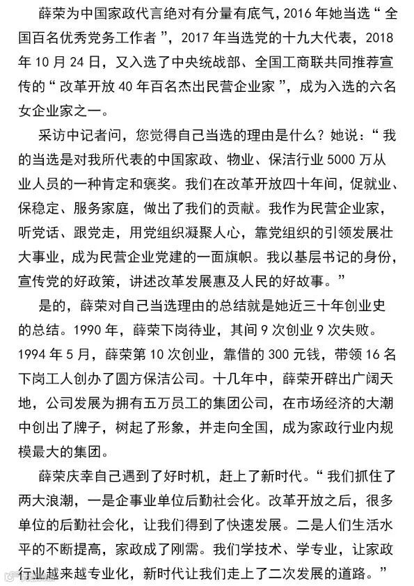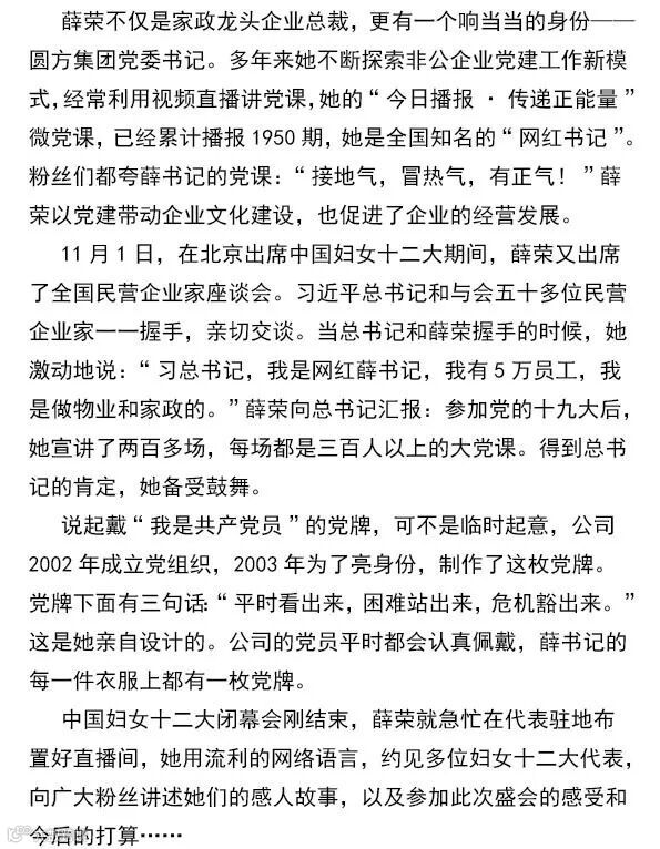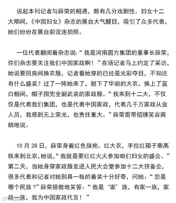 身着家政工作服出现在中国妇女十二大会场上的薛荣,格外引人注目。这位“网红书记”、河南郑州圆方集团董事长,不为自己博出位,而是要为中国家政代言。