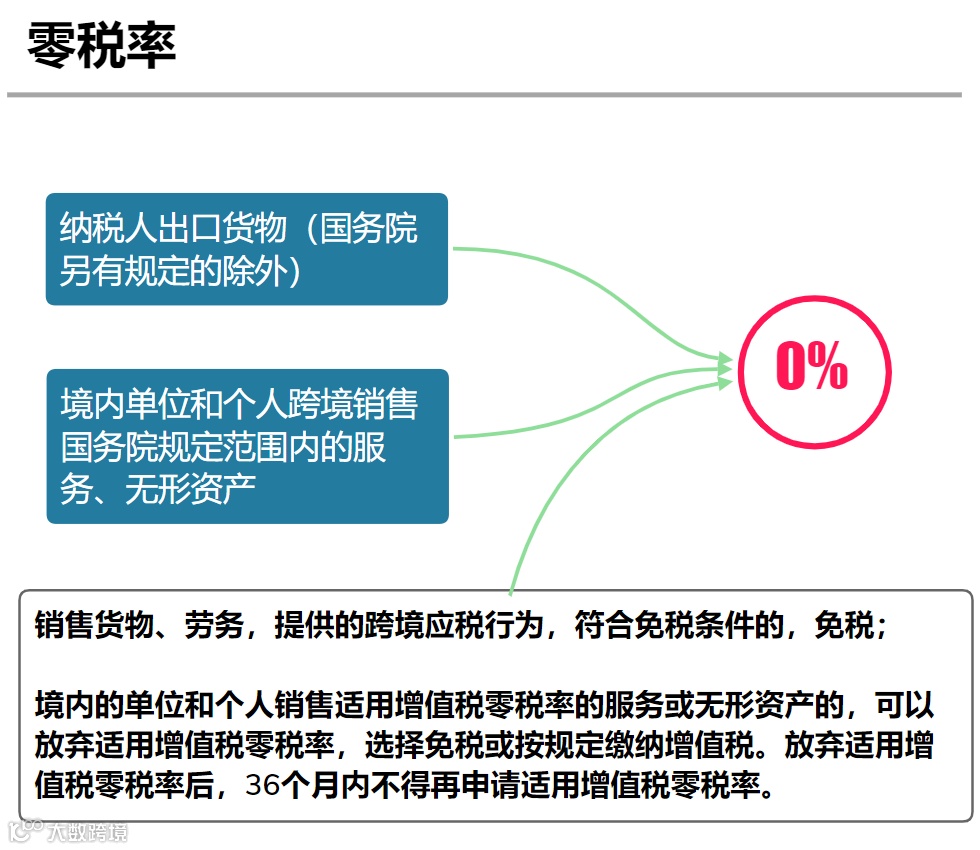 | 销售货物、劳务,提供的跨境应税行为,符合免税条件的,免税;境内的单位和个人销售适用增值税零税率的服务或无形资产的,可以放弃适用增值税零税率,选择免税或按规定缴纳增值税。放弃适用增值税零税率后,36个月内不得再申请适用增值税零税率。 | |||
