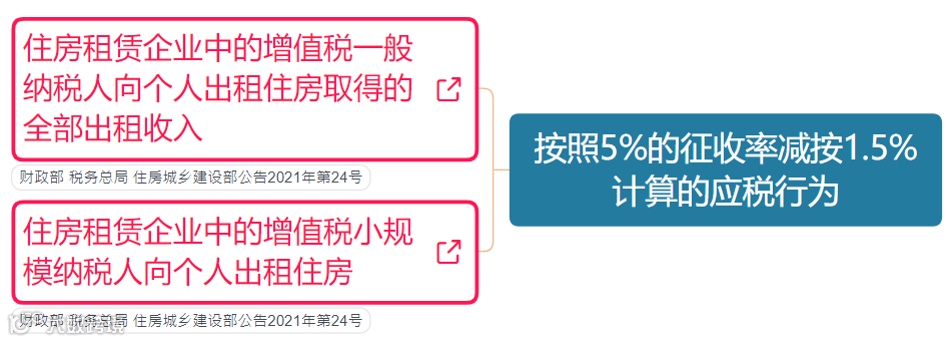 | 按照5%的征收率减按1.5%计算的应税行为 | 1、住房租赁企业中的增值税一般纳税人向个人出租住房取得的口全部出租收入(财政部 税务总局 住房城乡建设部公告2021年第24号) | ||