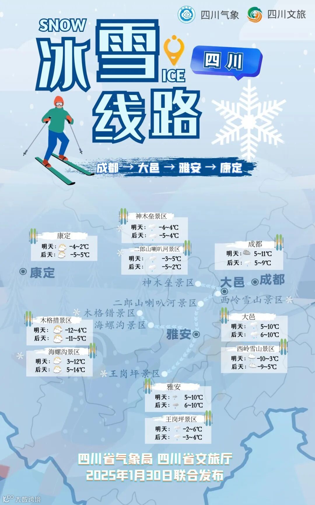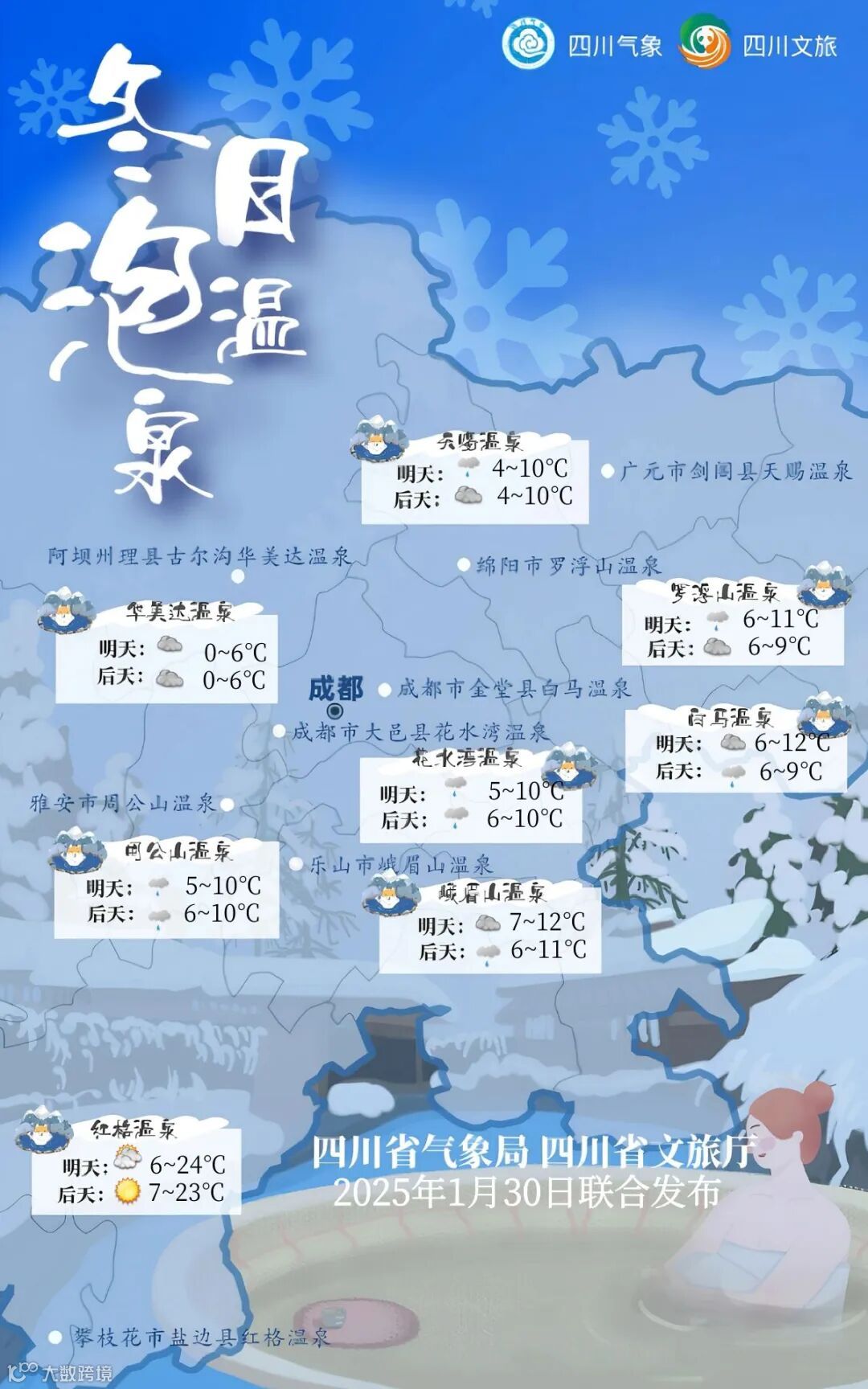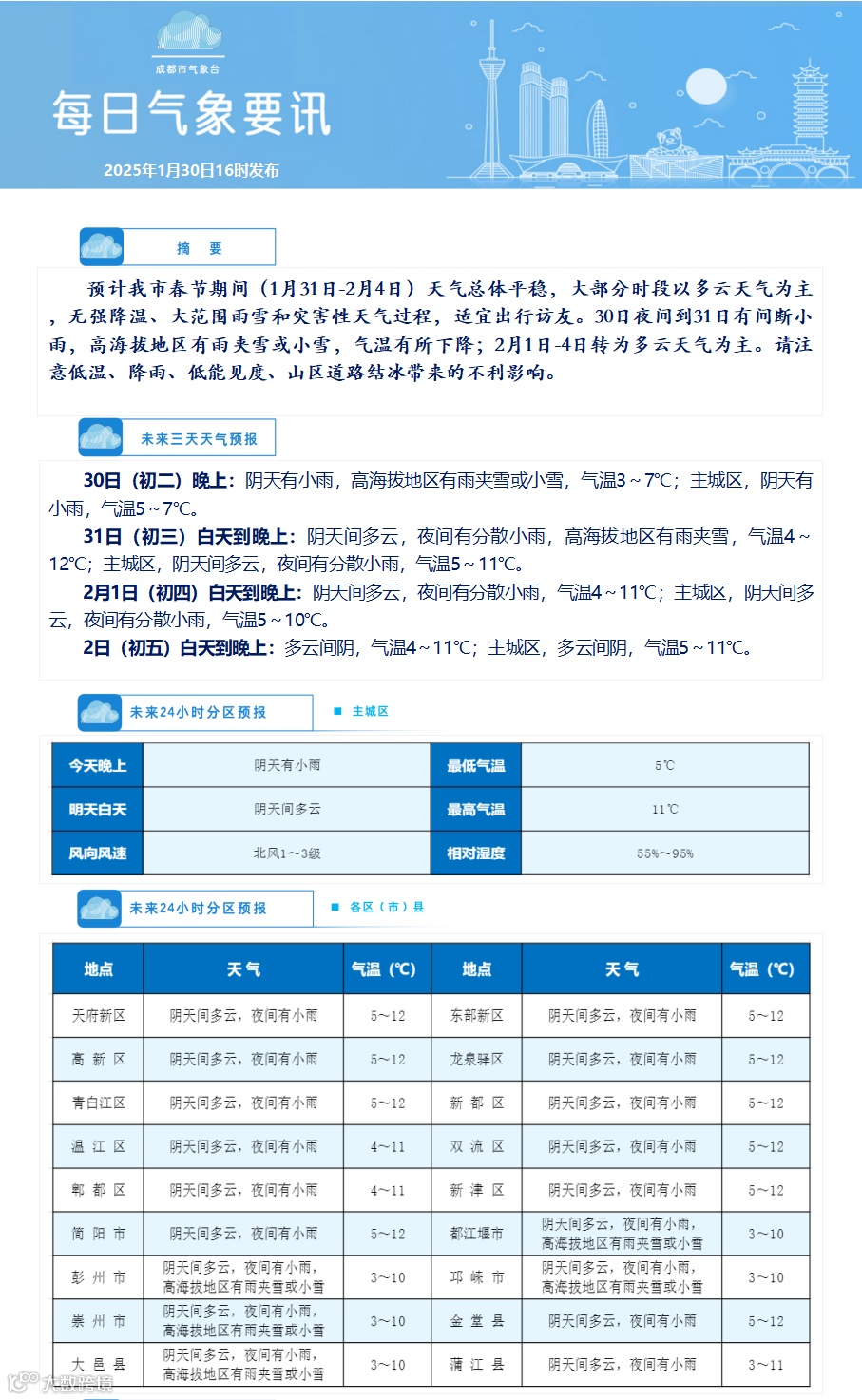 未来两天:盆地阴天间多云,大部地方有小雨,高海拔地区有雨夹雪或小雪;阿坝州大部和甘孜州北部有分散阵雪(雨),局部地方有中到大雪,需防范雨雪天气和道路结冰带来的不利影响。