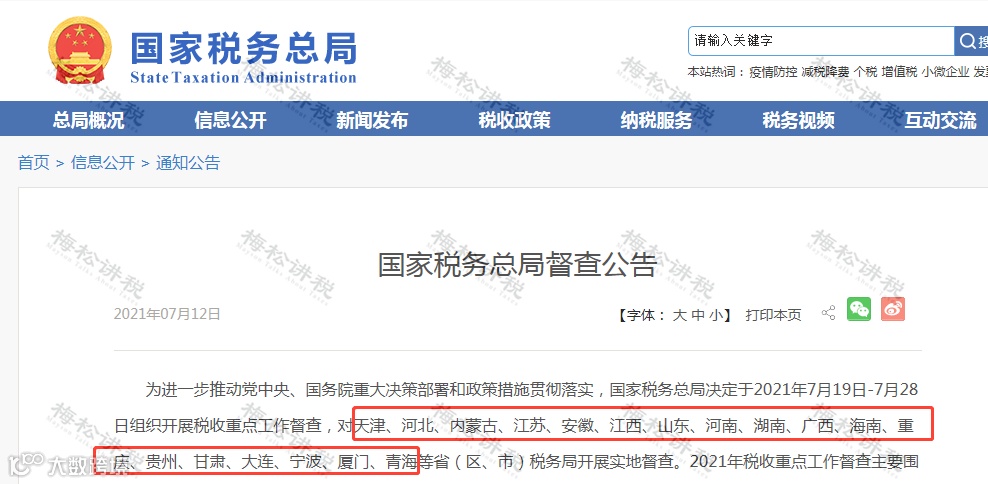 为进一步推动党中央、国务院重大决策部署和政策措施贯彻落实,国家税务总局决定于2021年7月19日-7月28日组织开展税收重点工作督查,对天津、河北、内蒙古、江苏、安徽、江西、山东、河南、湖南、广西、海南、重庆、贵州、甘肃、大连、宁波、厦门、青海等省(区、市)税务局开展实地督查。