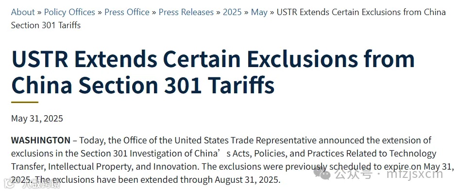 公告显示,此次延长豁免是基于对2023年12月29日公告收到的公众意见以及四年审查过程中提交意见的持续评估,美国贸易代表决定,将2024年5月所延长的164项排除和2024年9月新增的14项排除再次延长三个月。该决定综合考虑了此前的公众反馈、相关咨询委员会的建议以及301条款跨机构委员会的意见。