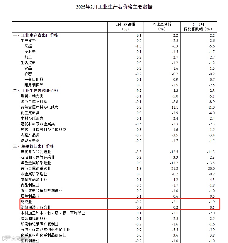 3、2月纺织业出厂价格同比下降2.1%;纺织服装、服饰业出厂价格同比下降0.2%