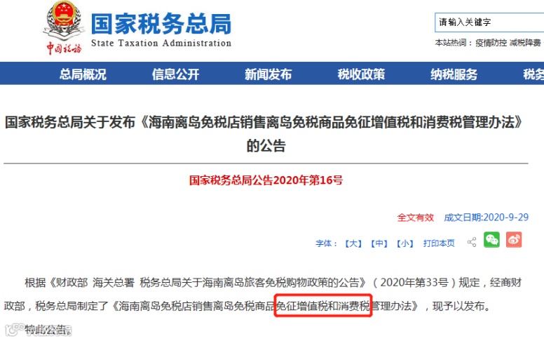 近日,国家税务总局发布最新公告,规定海南离岛免税店销售免税商品免征增值税和消费税。