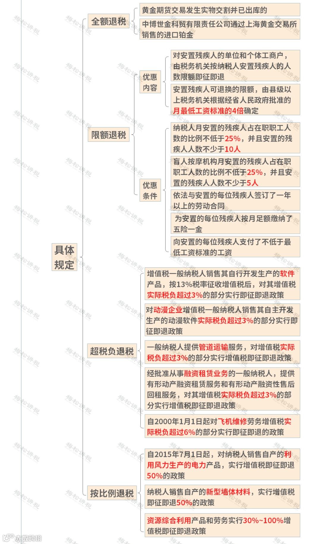 根据规定,对于按照规定申报缴纳税款且符合规定的,由税务机关在征收税款时,按规定全额或部分予以退还。主要有全额退税、限额退税、超税负退税以及按比例退税四种方式,具体我们准备了一张思维导图。