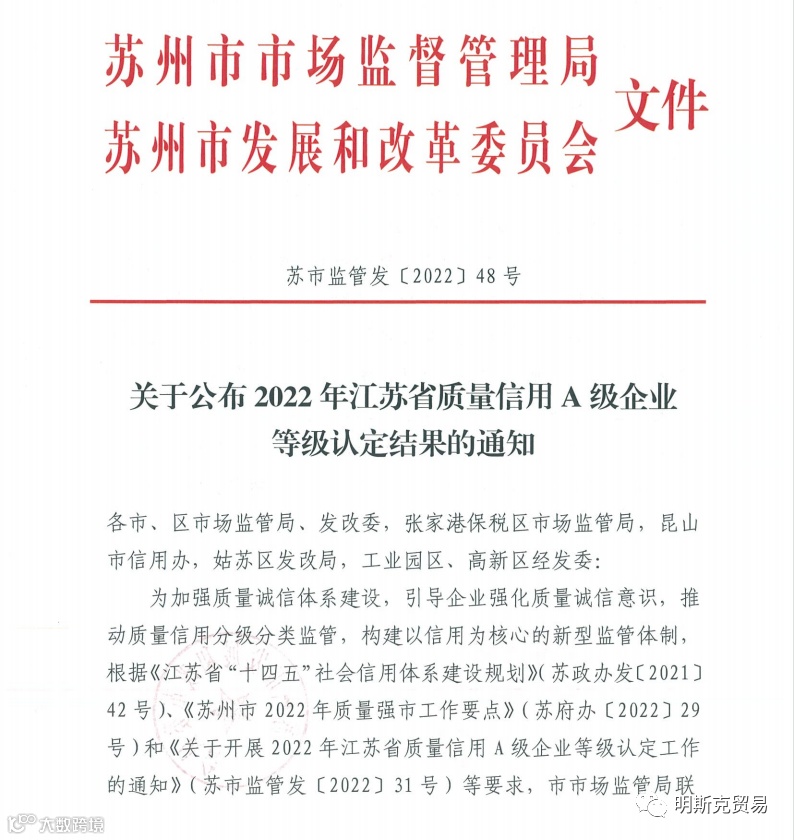 2022年5月26日苏州市市场监督管理局联合苏州市发展和改革委员会公布了2022年度江苏省质量信用A级企业等级认定结果的通知,吴江明斯克贸易有限公司名列其中,再获省级殊荣!