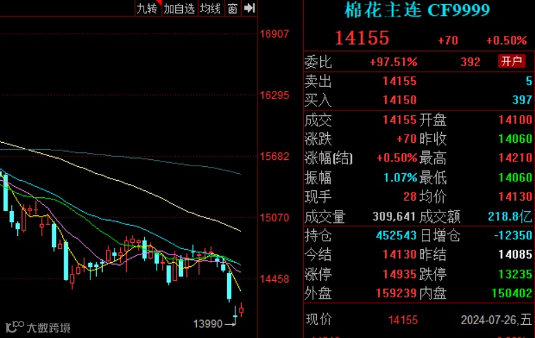 本周,国内外棉花期货价格共振破位下跌,ICE美棉期价失守70美分/磅大关后创下近四年来最低点,郑棉主力则加速下探14000元/吨大关。今年二季度以来,国内外棉价均呈弱势运行。4月1日至7月24日,郑棉跌幅达11.22%,美棉跌幅达25.19%。7月26日,郑棉主力合约上涨70元收于14155元/吨。
