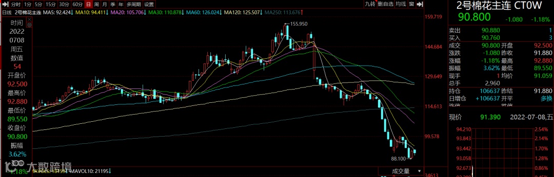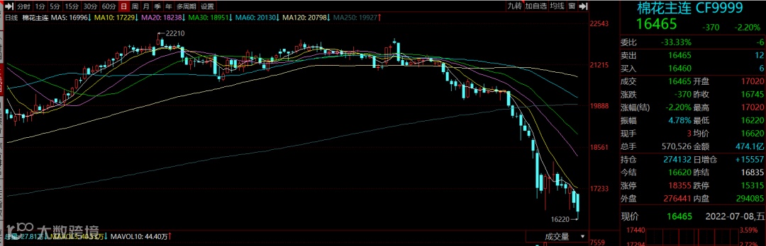 7月8日,郑棉主力合约花跌超2.2%,收盘价16465元/吨。