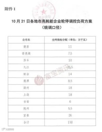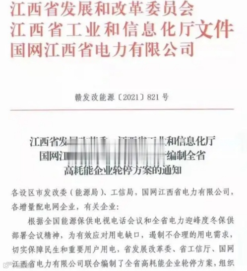 而此前,江西省发展发改委、工信厅、国网电力就曾联合发出《关于编制全省高耗能企业轮停方案的通知》。
