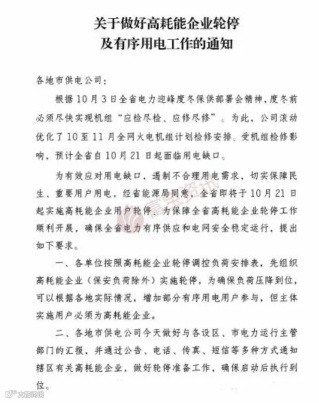 据该《通知》显示,受机组检修影响,预计全省10月21日起面临用电缺口,为有效应对,遏制不合理用电需求,切实保障民生、重要用户用电,经省能源局同意,全省即将于10月21日起实施高能耗企业用户轮停。
