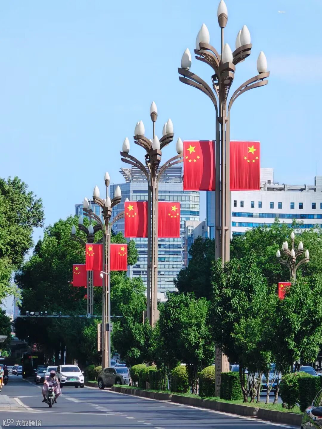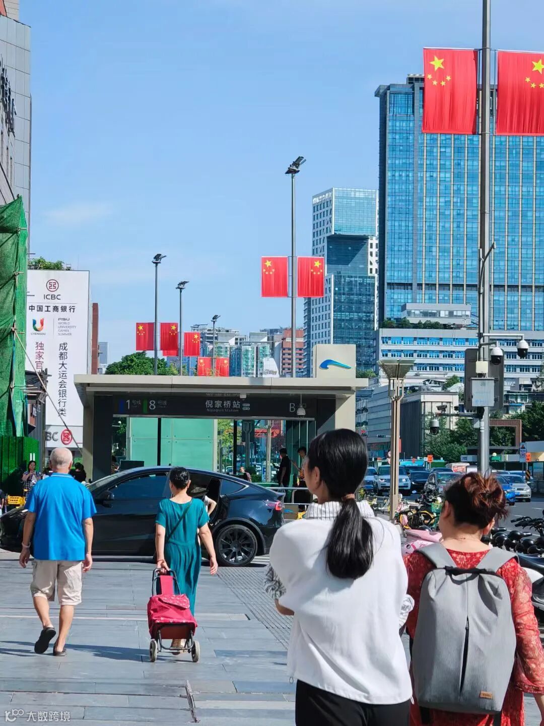 目前,成都中心城区天府广场、人民南路、蜀都大道、金牛大道、迎宾大道、武侯祠大街等多条道路已挂上了鲜艳的五星红旗,满城洋溢“中国红”。