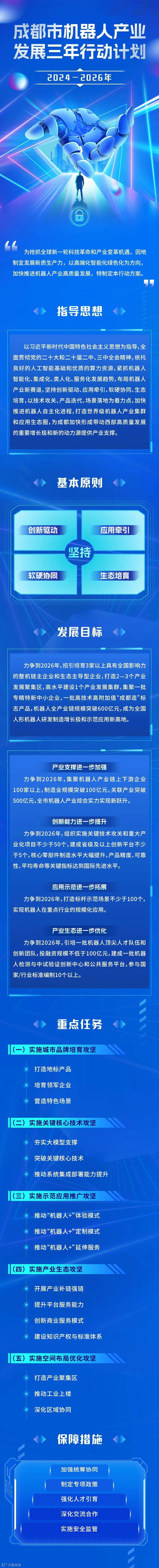 《行动计划》提出实施城市品牌培育攻坚、实施关键核心技术攻坚、实施示范应用推广攻坚、实施产业生态攻坚、实施空间布局优化攻坚等重点任务。并明确未来三年成都市机器人产业发展将坚持创新驱动、应用牵引、软硬协同、生态培育,以技术攻关、产品迭代、场景落地为着力点,加快推进机器人自主化进程。力争到2026年,全市机器人产业创新能力显著提升,打造100款机器人新品、聚集100家产业链上下游企业、打造100个标杆示范场景,全产业链规模突破600亿元,建成全国人形机器人研发制造增长极和示范应用新高地。