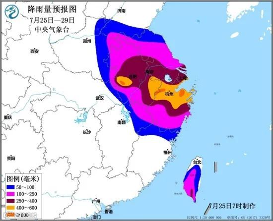 中央气象台预计,预计7月25日至29日,台湾岛、浙江、上海、江苏、安徽、福建北部、江西东北部、山东南部、河南东部等地先后有大到暴雨,台湾中南部、浙江、上海、江苏南部和西部、安徽等地的部分地区有大暴雨,局地有特大暴雨。上述地区累计降雨量有60~180毫米,浙江中北部、上海、江苏南部、安徽中南部及台湾南部等地200~500毫米,局地可超过700毫米;最大小时降雨量40~60毫米,局地可达80毫米以上。