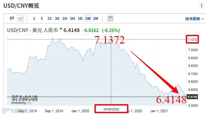 2020年全年,人民币对美元汇率累计升值幅度接近7%,从2020年5月份开始升值幅度最高超过了9%。