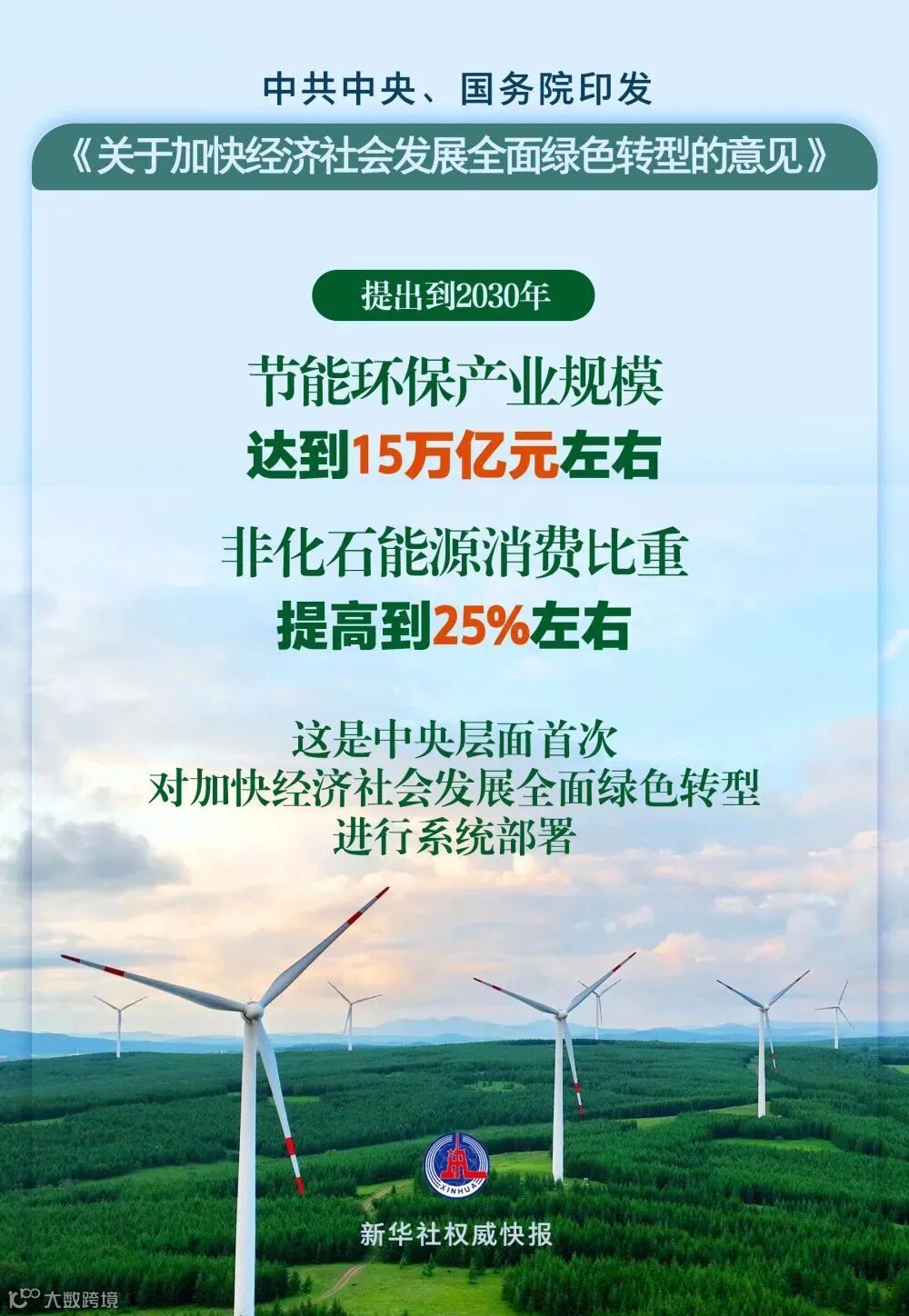中共中央、国务院印发的《关于加快经济社会发展全面绿色转型的意见》8月11日发布,这是中央层面首次对加快经济社会发展全面绿色转型进行系统部署,涵盖了区域发展、产业结构、能源、交通运输、城乡建设等不同领域。