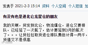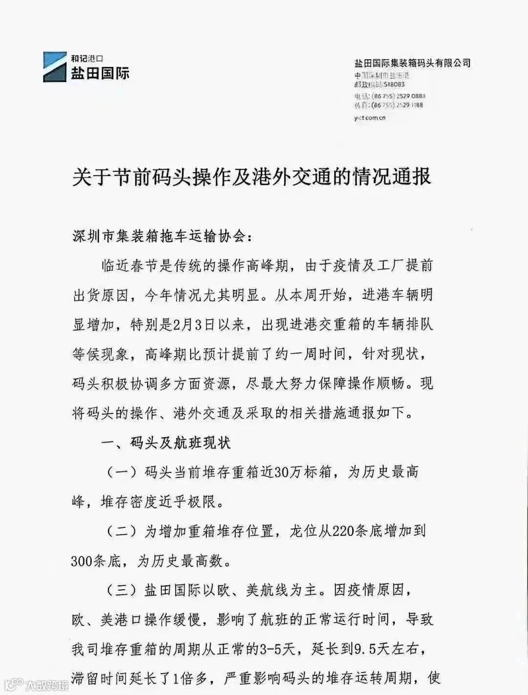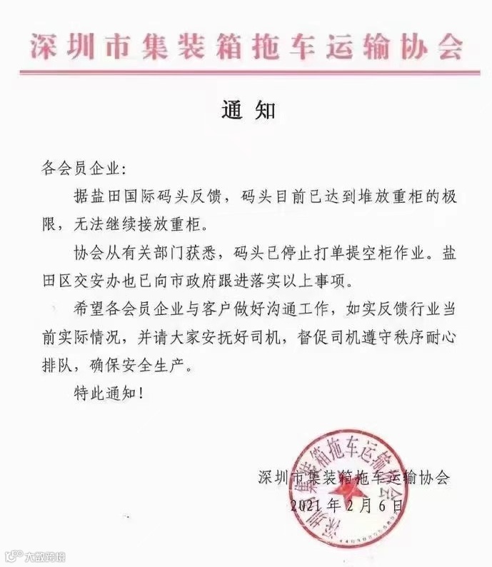 2021年2月4日,盐田国际发布了《节前码头操作及港外交通的情况通报》,通报称,当前盐田码头已达到堆放重柜的极限,提柜也变得非常缓慢,只能将码头内的部分空柜、进口重柜转至码头外堆放,最大限度释放出口重柜堆存能力。