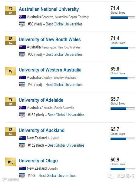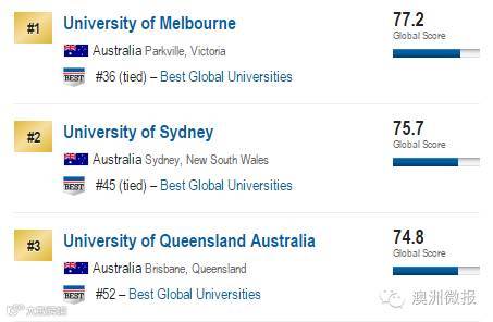 接下来莫纳什大学、澳洲国立大学、新南威尔士大学及西澳大学均杀入美国大学排行百名榜,位次依次为79、80、80及95!