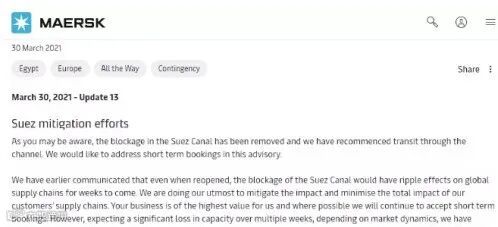 “除了运力下降,苏伊士运河堵塞事件还将带来严重的港口拥堵。因为船舶挂靠错过了之前的窗口期,需要进行港口挂靠调整,以降低运力损失。我们现在的工作是积极为客户出运寻找替代方案,重建稳定的网络,保持信息透明。”马士基补充说。
