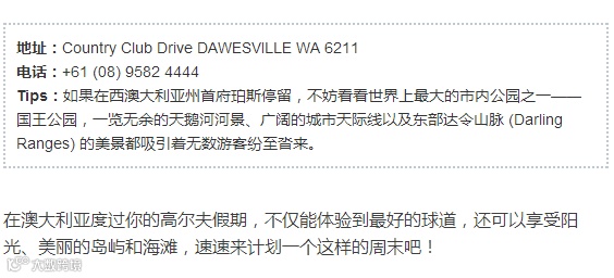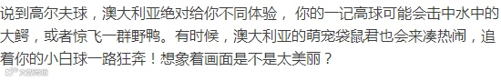 导读:说到高尔夫球,澳大利亚绝对给你不同体验, 你的一记高球可能会击中水中的大鳄,或者惊飞一群野鸭。有时候,澳大利