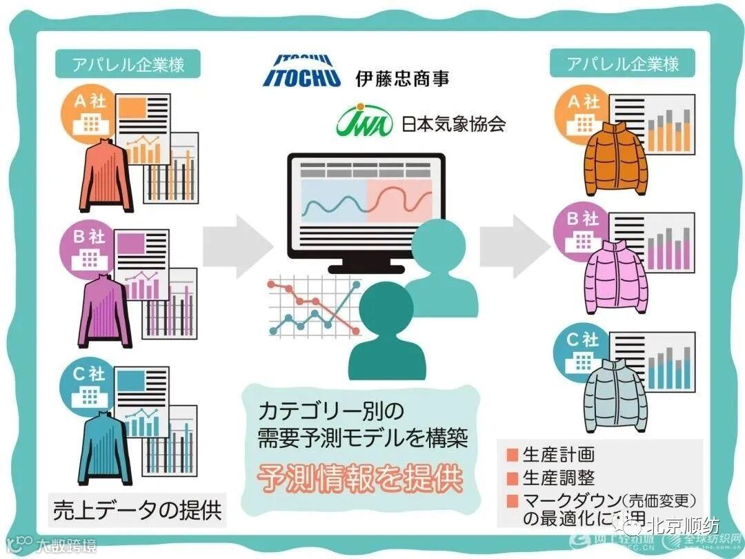 据悉,伊藤忠旗下的多个服装企业过往的销售数据,将与日本气象协会的气象数据进行整合,以此为基础来预测各商品品类的中长期市场需求,并依次调整生产和销售计划。