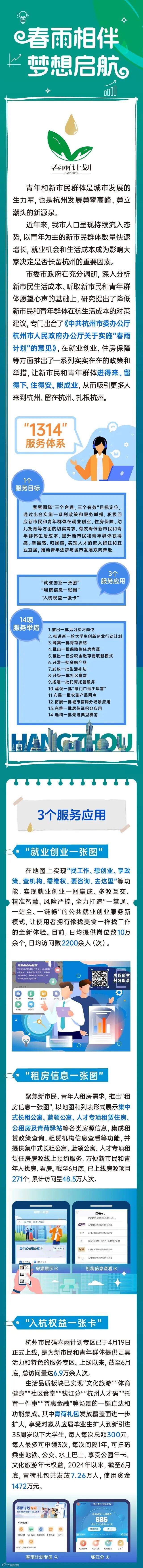近年来,杭州以青年为主的新市民群体快速增长。为了吸引更多人来到杭州、留在杭州、扎根杭州,杭州出台实施“春雨计划”,在就业创业、住房保障等方面推出一系列实实在在的政策和举措,让新市民和青年群体进得来、留得下、住得安、能就业。一图带你了解“春雨计划”的详细情况。