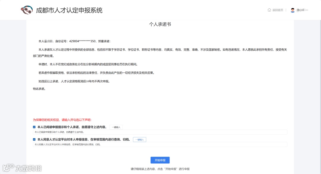 3. 查看个人承诺书,输入并勾选声明,即可进入下一步。