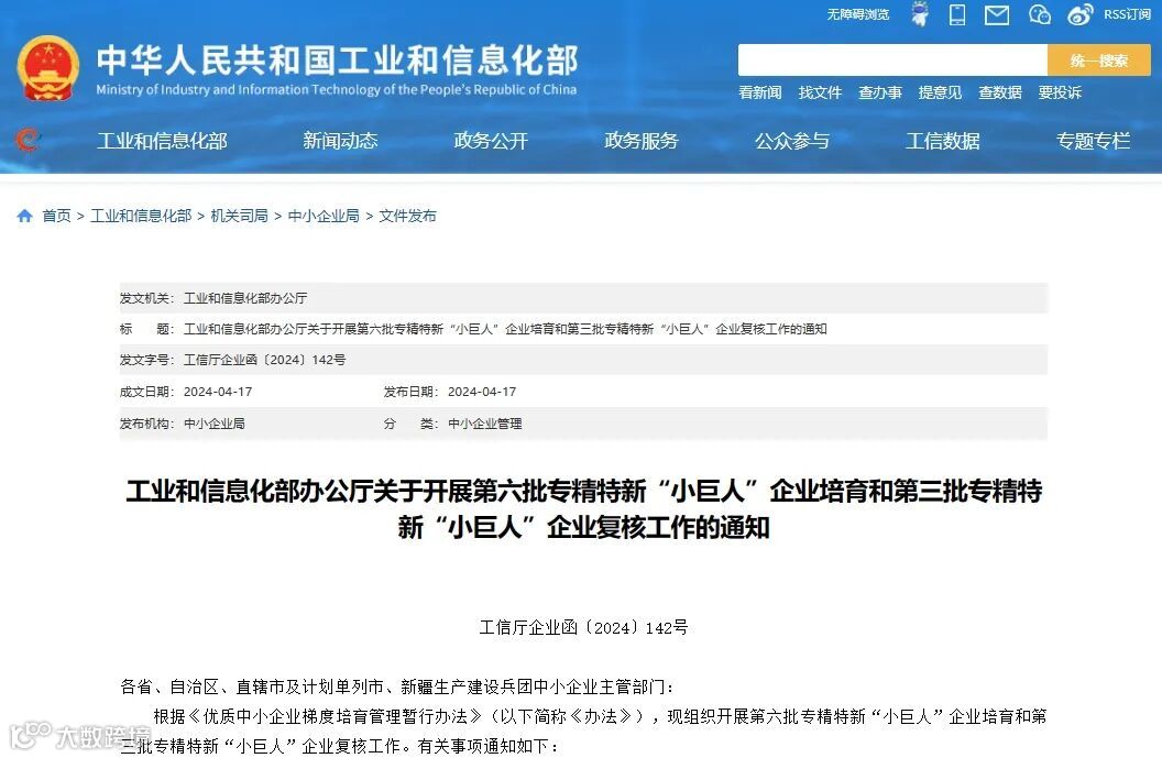 工业和信息化部近日印发通知,组织开展第六批专精特新“小巨人”企业培育工作。省级专精特新中小企业可提出第六批专精特新“小巨人”企业申请,各省、自治区、直辖市及计划单列市、新疆生产建设兵团中小企业主管部门负责组织第六批专精特新“小巨人”企业初核推荐。工业和信息化部将按照《优质中小企业梯度培育管理暂行办法》(以下简称《办法》)要求和审核流程,组织对各地推荐企业进行审核并实地抽查,最终形成并印发第六批专精特新“小巨人”企业名单。第三批专精特新“小巨人”企业复核工作同时启动。